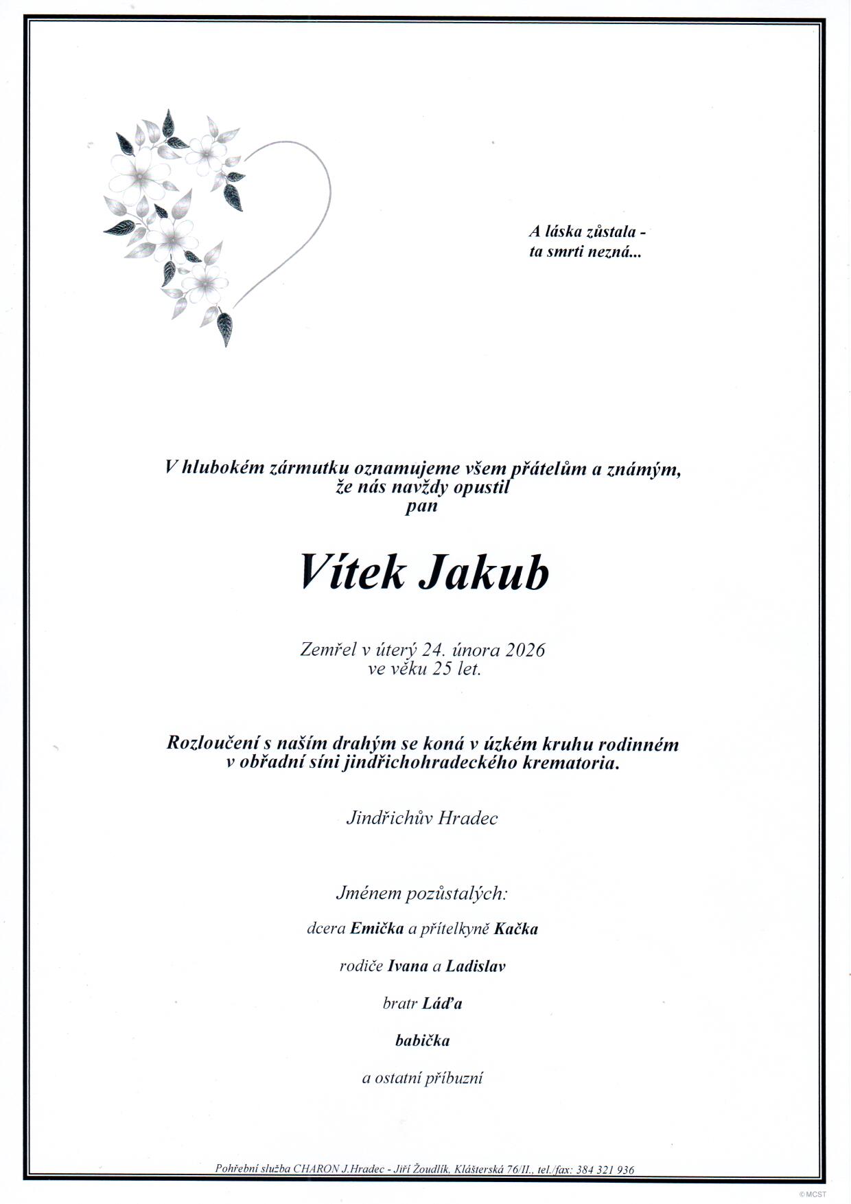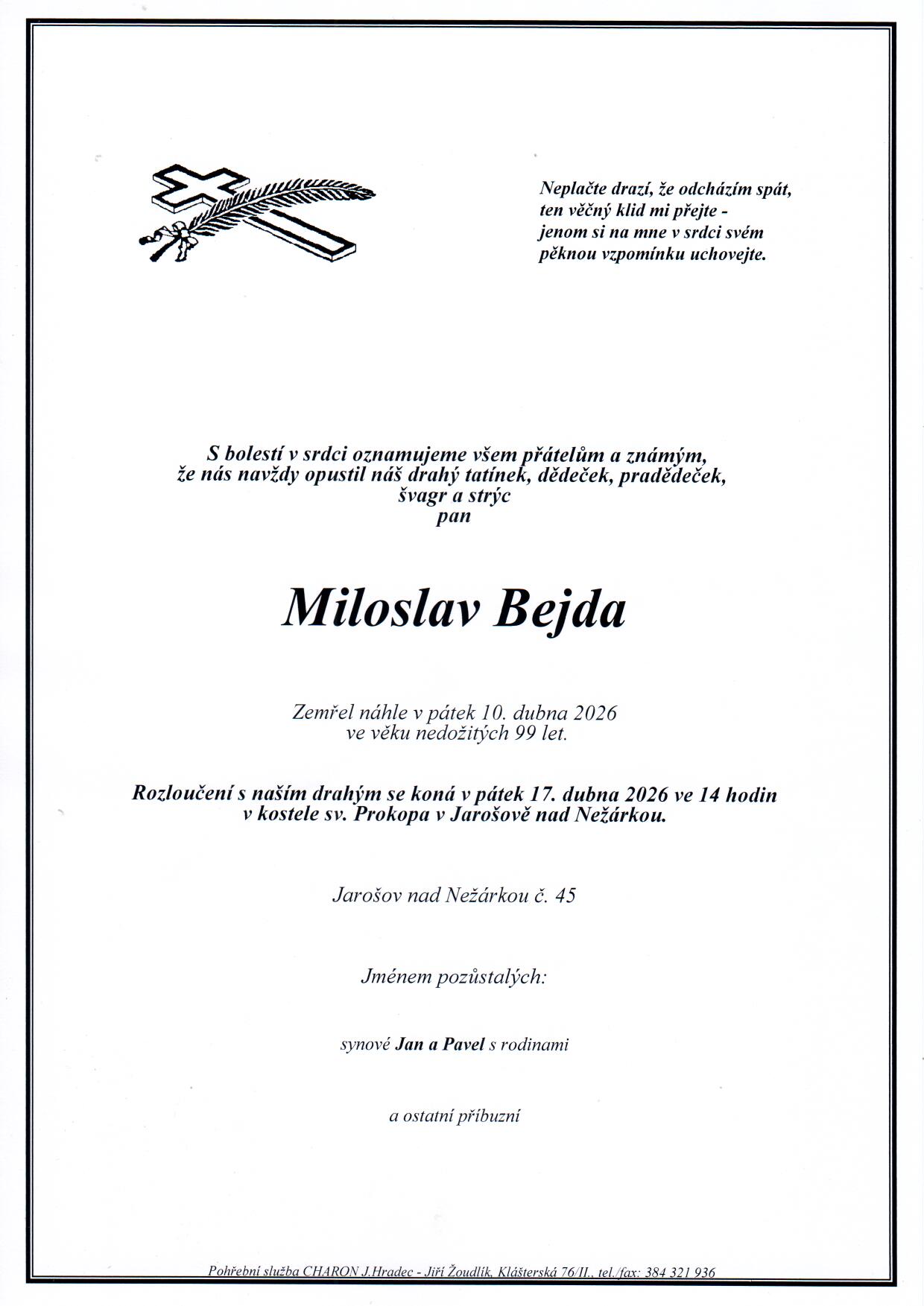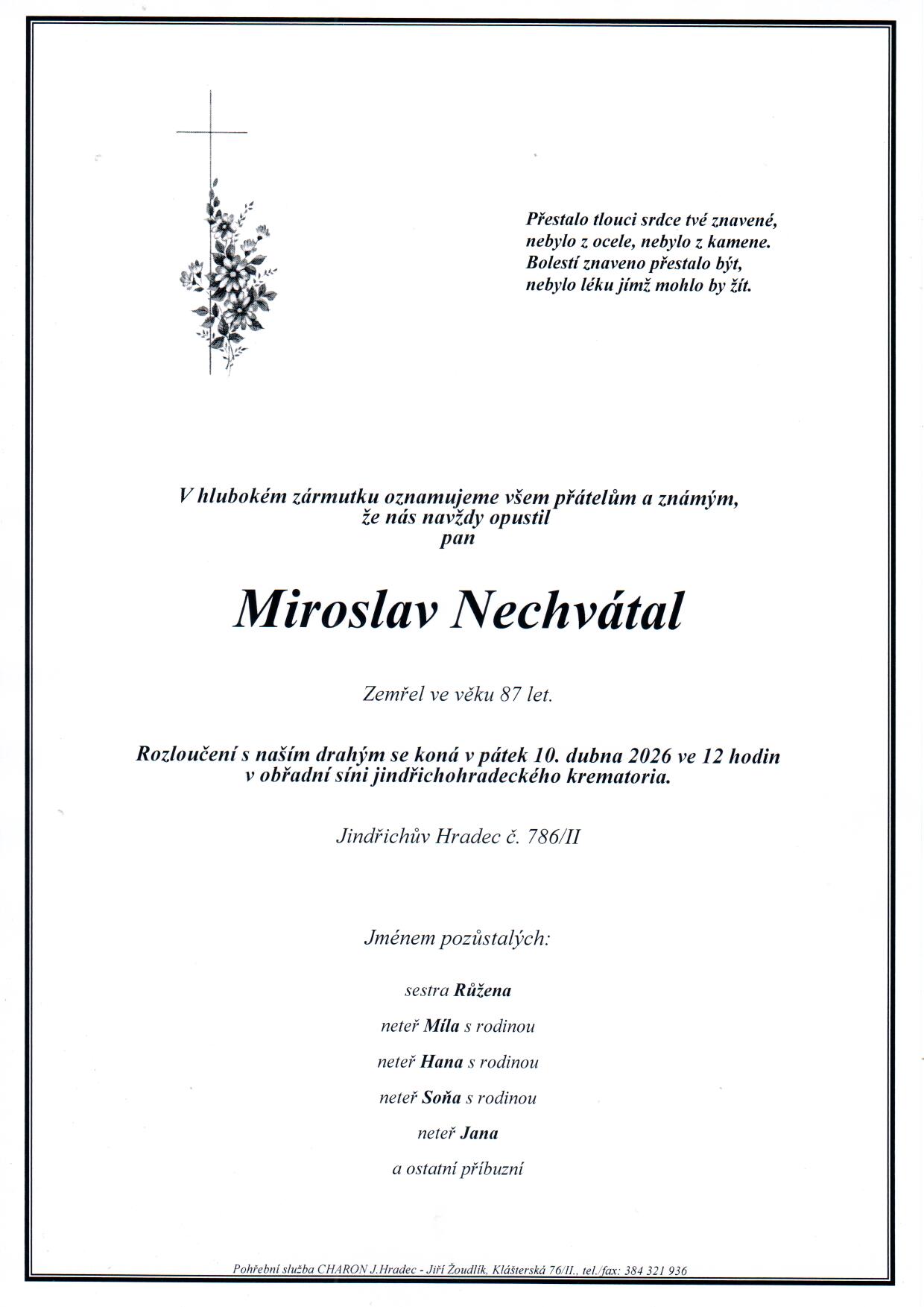 Kontaktní informaceJiž 30 let pro vás zajišťujeme veškeré pohřební a kremační služby, které spadají nejen do těchto měst: Jindřichův Hradec, Nová Včelnice, Jarošov nad Nežárkou, Strmilov, Kunžak, Stráž nad Nežárkou, Kardašova Řečice, Deštná, Lodhéřov, Nová Bystřice, Chlum u Třeboně.